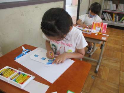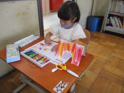画用紙を「折って立てたらなんの形に見えるかな?」折り方や切り方を工夫して作りました。家,動物,滑り台,土俵などいろいろなものができました。