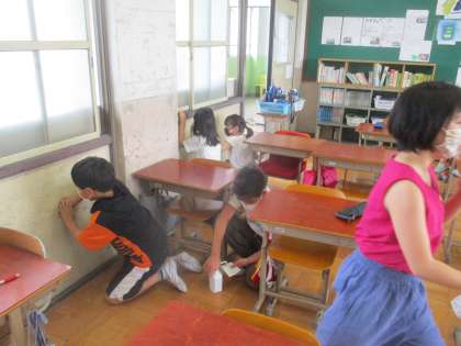 壁の落書きなどは消毒液を用いて紙ペーパーで消しています。