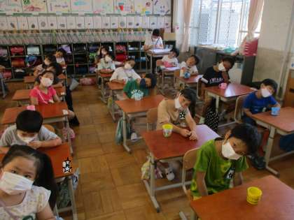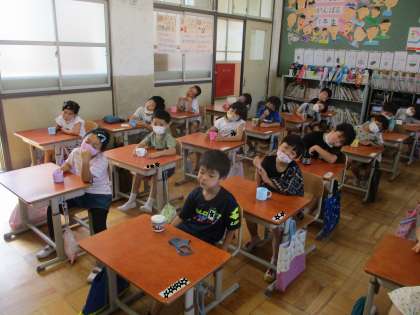 今日も水を使ってフッ化物洗口をしました。上手に顔を傾けられるようになりました。来週からは,洗口液を使って実施します。