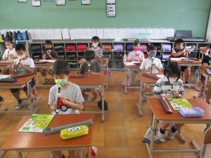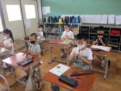 音を出さずにリコーダーの演奏の練習をしている様子です。