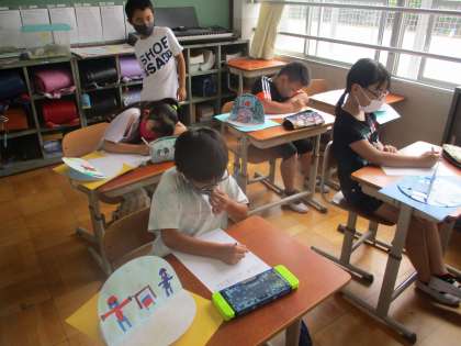 友だちの作品を鑑賞したり,ワークシートに作品のいいところを書いたりしている様子です。