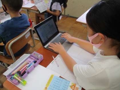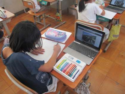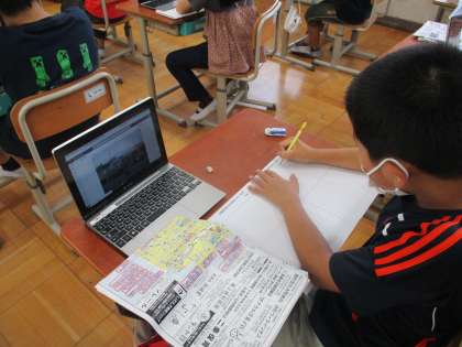 タブレットを使って校区の紹介パンフレットを作っている様子です。