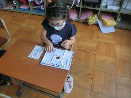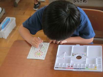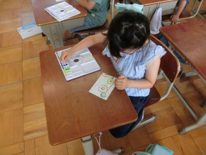 書写の時間に暑中見舞いを書きました。丁寧な文字で宛先が書けるように,何度も練習する姿が見られました。花火を描き,はがきが完成しました。ポストに投函するのを楽しみにしていました。