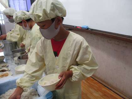 給食当番が給食の用意をしています。