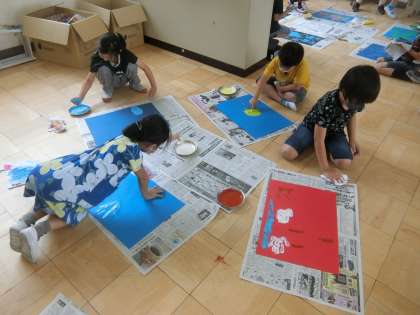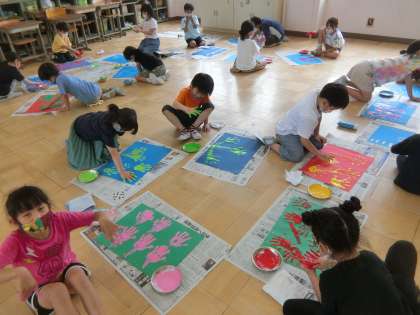 2年生の図工では,とろとろえのぐでかきました。指に液体粘土をつけて,たのしみました。