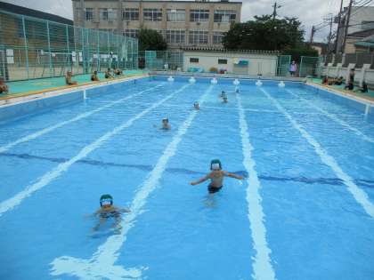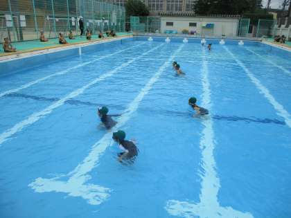 今日から水位が上がり,子どもたちのおへその上あたりの水の量になりました。今日は,アヒル,かにになって水の中で息を吐いてみました。その後,みんなでロケットになりました。頭までつかるのは,少し怖いようでしたが,だんだん上手にロケットになって飛べるようになりました。