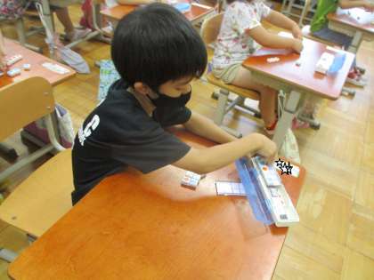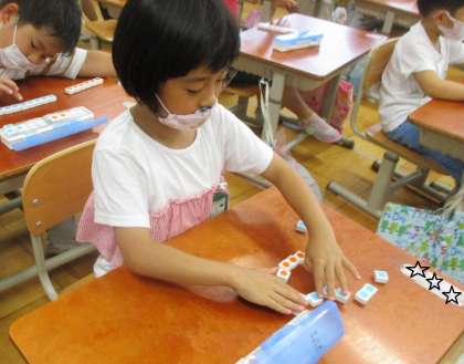 ちがいはいくつの学習が始まりました。今日は,ブロックを使って『同じ』と『ちがい』の部分を考える学習です。2色のブロックでくらべっこをする置き方をしながら『ちがい』を見つけることができました。