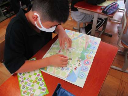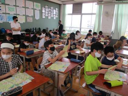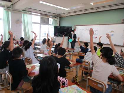 税理士の方がゲストティーチャーとして,「税」について教えてくださいました。ワークシートにシールを貼って町づくりをし,どんなところにどれくらいの税金が使われているのかを知ることができました。クイズ形式で楽しく進み,最後はいろいろな質問にも答えてもらいました。また,お家でも「税」について話し合ってみてください。