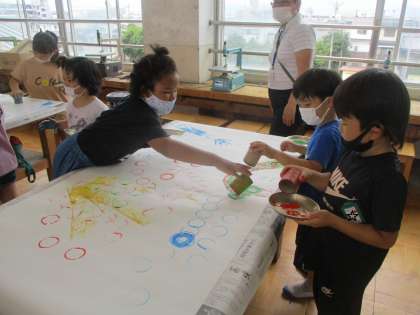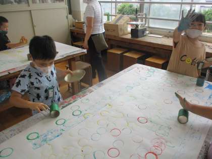 絵の具を使って学習をしました。筒に絵の具をつけてぺったんしたり,筒の周りに絵の具をつけてコロコロしたりしました。重ねたり,色を変えたりすると,いろいろな形になったようです。