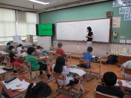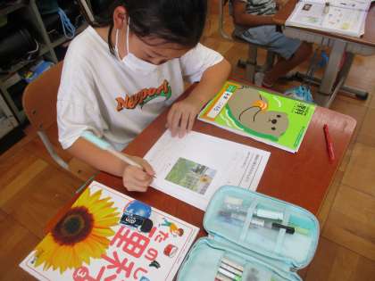 2つの植物の花をくらべながら,育ち方を調べている様子です。
