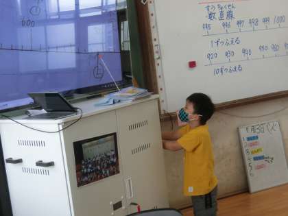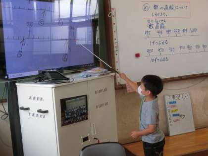 2年生の算数では,数直線をつかって学習をすすめています。答えをテレビに映し,説明しています。