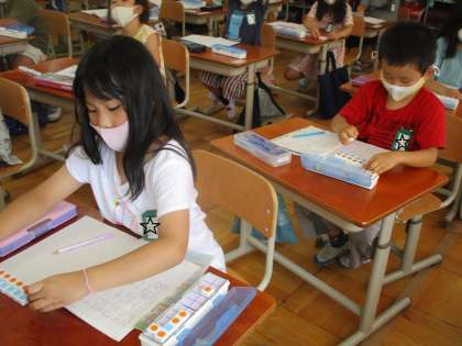 ひきざんの文章題に取り組みました。ブロックを並べたり,動かしたりすることも自分で考えてできるようになってきました。