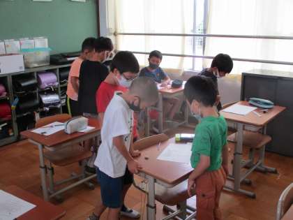 一人ひとりが考えた迷路を交流している様子です。友だちが考えたたくさんの工夫を見つけることができました。