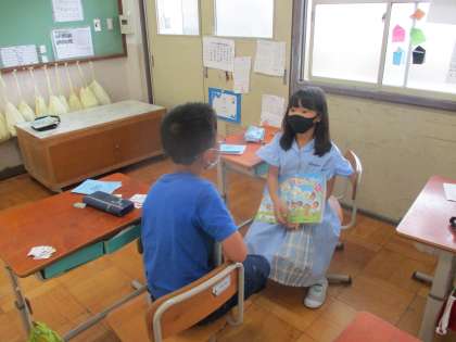 友だちに自分の好きなスポーツや色を伝えている様子です。