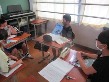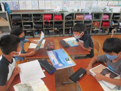 自分がおすすめする本を班の友だちに紹介している様子です。