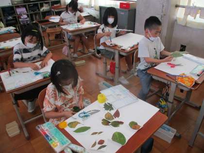 昨日,集めた葉や作った葉っぱカードを使ってどのような作品を作るか考えている様子です。