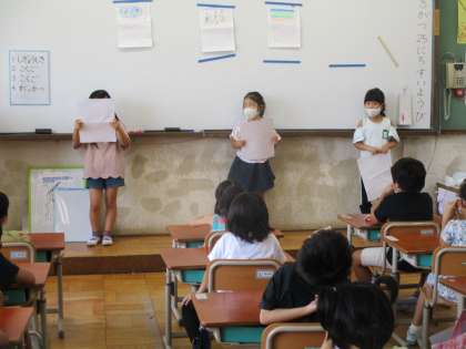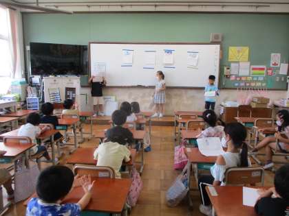 夏休みに書いた絵日記をもとに,夏休みの思い出を発表しました。いろいろ気をつけなければならない中,おうちの方と一緒に楽しい時間が過ごせたことが伝わってきました。「話す」のは上手になってきていますが,「聞く」方はこれから力をつけていく必要がありそうです。