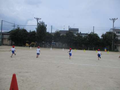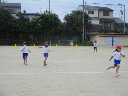 今日は「とびあそび」をしました。じゃんけんをして勝ったら進める遊びや,川を飛び越しながら走るリレーなどをして遊びました。手足を上手に使ってジャンプすることを練習していきます。