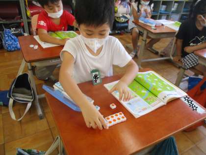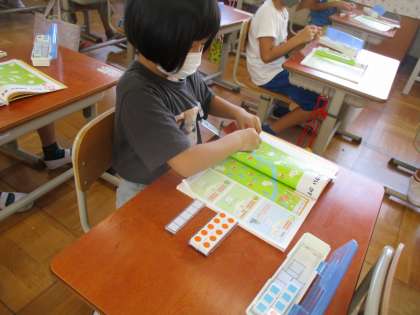 教科書に載っている絵の数を数えるため,ブロックを置いて,10といくつになるかを考えました。「じゅう」と「さん」で「じゅうさん」になるなどを学習しました。ブロックを,数が分かりやすいように並べられるようにもなってきました。