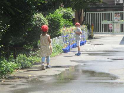 朱六の森の前を通ると,水がまかれていて,小さな水たまりのようになっていました。その水たまりをジャンプしてよけながら進んで遊んでいました。