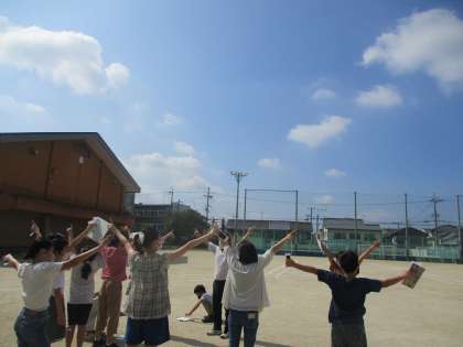 運動場に出て,月の形と,月と太陽の位置(方位・高さ)を調べました。月と太陽を左右の指でさし,腕の開き具合で確認しました。2日後の同じ時刻,どのような変化をしているか観察する予定です。