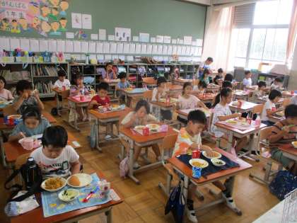 スパゲティは,口の周りにたくさんつけながらいっぱい食べていました。今日は給食修了時間より10分も早く食べ終わることができました。
