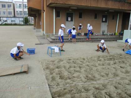昨日子どもたちが耕してくれた砂場で幅跳びを行いました。