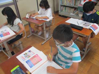 2つのポスターを見比べて気づいたことを書いている様子です。