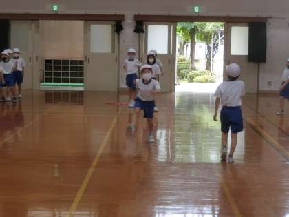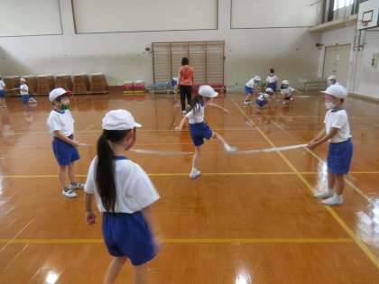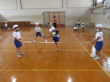2年生の体育で行っている跳び遊びでは,5歩とびや,ゴムを使ったとびこしに挑戦しました。めあてを決めて飛び越すことが,とても楽しいようで熱心に取り組んでいます。