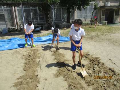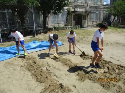 雨が降り,シートに水たまりができていたので,明後日の幅跳び用に砂場を耕してくれました。
