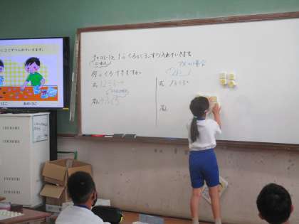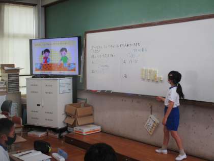 みんなに数図ブロックを使って解き方を伝えている様子です。