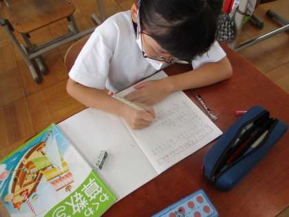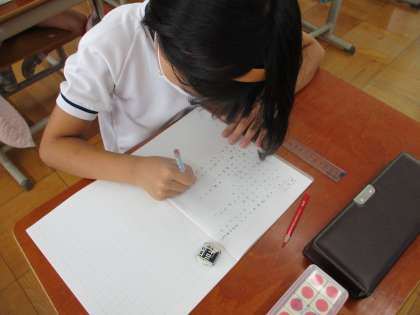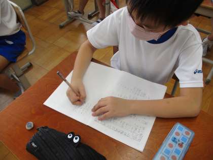 自分の考えを図や言葉を使ってノートにかいている様子です。