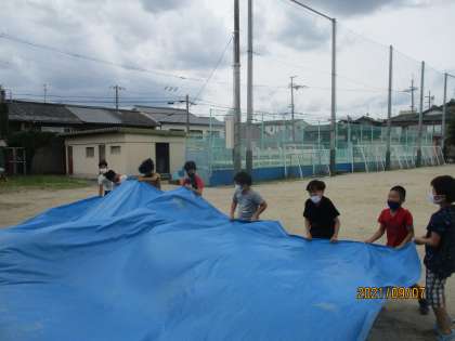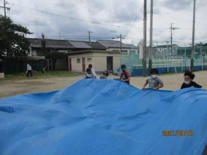 ブルーシートをパタパタして汚れを落としています。