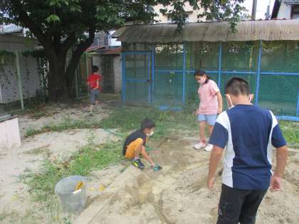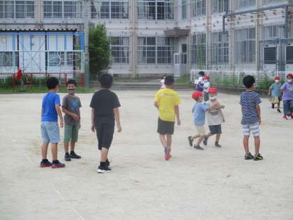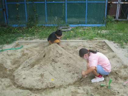 子どもたちが砂場やグラウンドで元気に遊んでいる様子です。