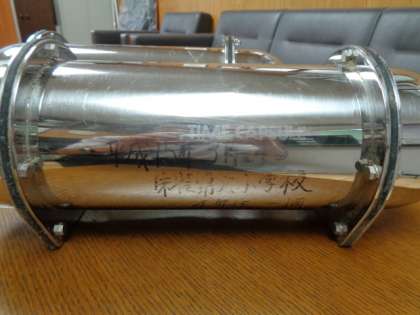 銀色のに光るカプセルには「平成15年3月24日 朱雀債六小学校 4年生一同」と書かれていました。