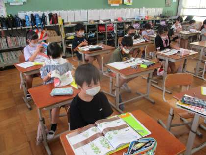 ヒマワリとホウセンカの成長の様子をまとめている様子です。