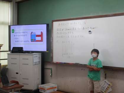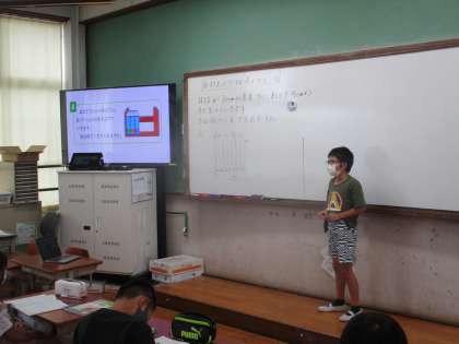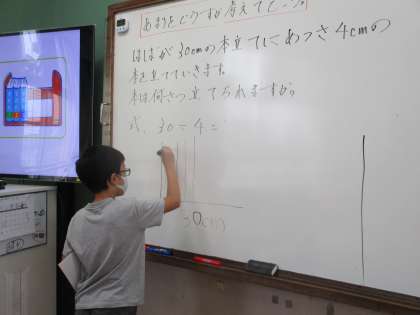 自分で考えた解き方を図や言葉を使って説明している様子です。