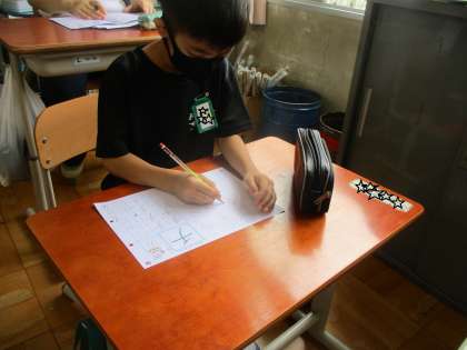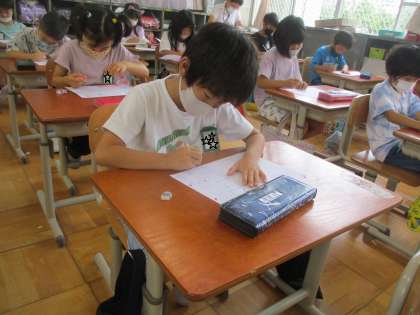 漢字は,一から十までの漢数字の学習が終わったので,今日は「子」です。子どもの意味があるときに使うということから,言葉集めをしました。「男子」「女子」「子犬」「ねず子」などが出てきました。とめはねにも気をつけて練習をしました。