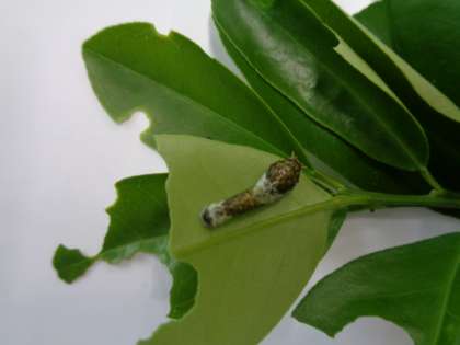 そう,アゲハの幼虫です。これから脱皮をしておなじみの緑色の幼虫へと成長していきます。見守ってあげてください。