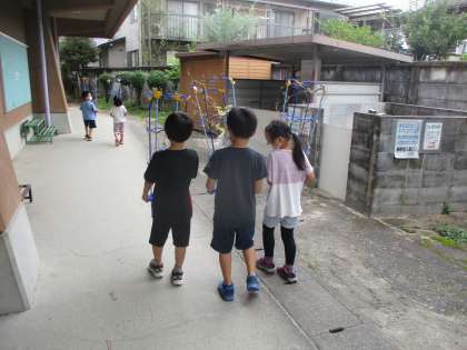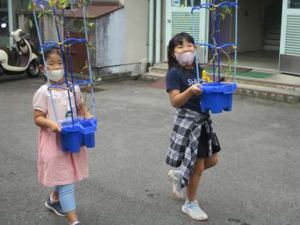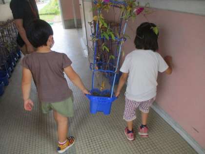 台風が接近しているため,校舎内にアサガオをお引越しさせました。友だちと協力しながらがんばって運びました。