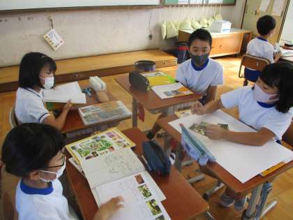 資料を見て八つ橋がどのようにつくられるかをグループで考えている様子です。