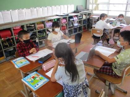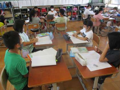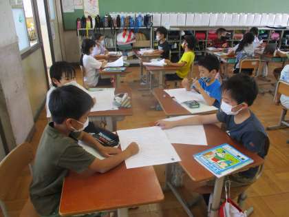 2つの「かげおくり」を比べて感じたことを友だちに伝えている様子です。