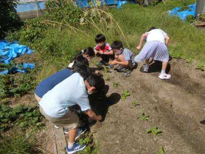 2年生の畑で育てている,大根がどんどん大きく育ってきています。水やりも協力して毎日行っています。