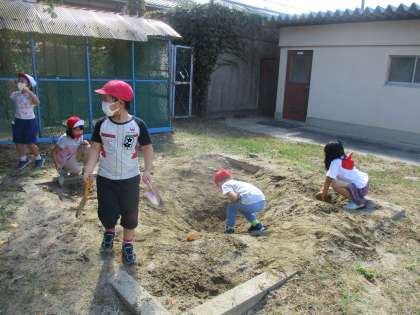 この間掘っていいた穴。大きな穴になっています。飛び越えたり覗いたりして喜んでいます。