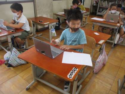 「いきものとなかよしになろう」の学習です。うさぎのモモちゃんをお世話するためにどんなことを知りたいかを考えて,6年生に教えてもらうためのビデオレターを作っています。今日は,使い方に慣れました。木曜日に本番撮りをする予定です。