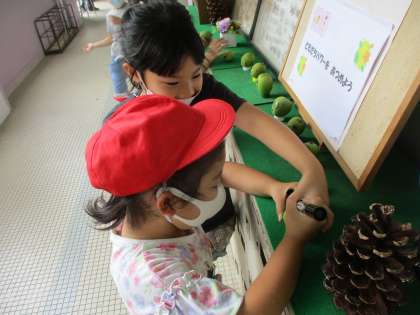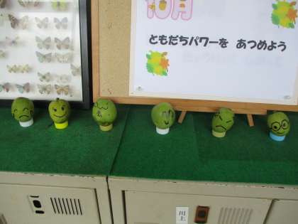 朱六の森に落ちている「かりん」を拾って顔を描いていました。校長室の前には,かわいいかりんちゃんたちが並んでいます。