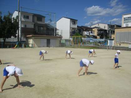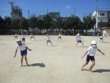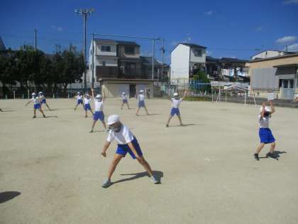4年生と一緒にグラウンドで「ソーラン節」の練習をしている様子です。