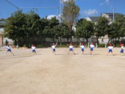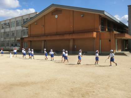 今日から外に出て1・2年生合同での練習が始まりました。並び方や場所移動の方法をみんなで確かめました。