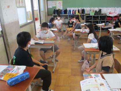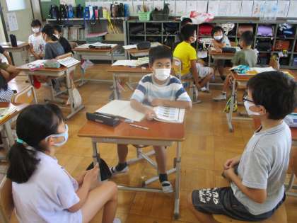 グループで八ツ橋がどのように作られているのかを教科書の資料を見ながら考えている様子です。