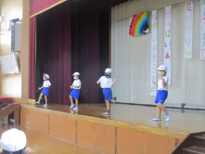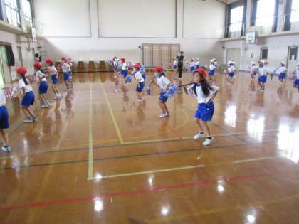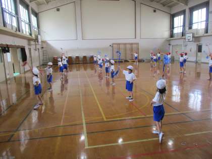 今日は,はじめに体育館で準備体操をしました。2年生の代表の人たちが前で進めてくれました。その後,2つのグループに分かれて運動場と体育館でダンスの練習をしました。